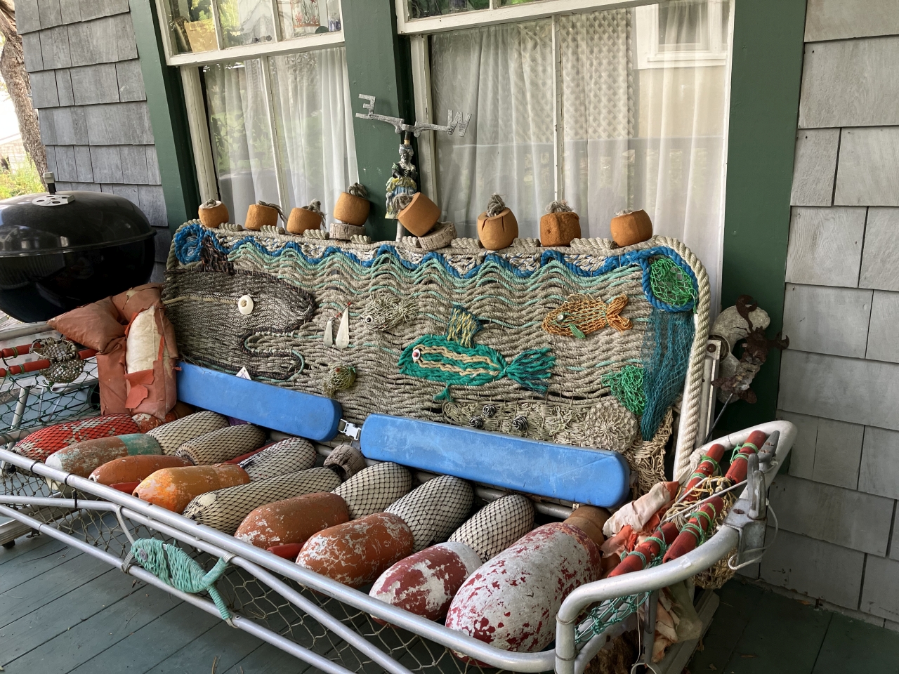 2023-11-13 A Nod to the Sea, photographed by Beverly Crofoot in Bayside, ME on Harry Rosenblum’s Bay Street porch. Have a seat. #nodtothesea #haveaseat #cushionsnotincluded #willitfloat #porchlife #baysidemaine See less