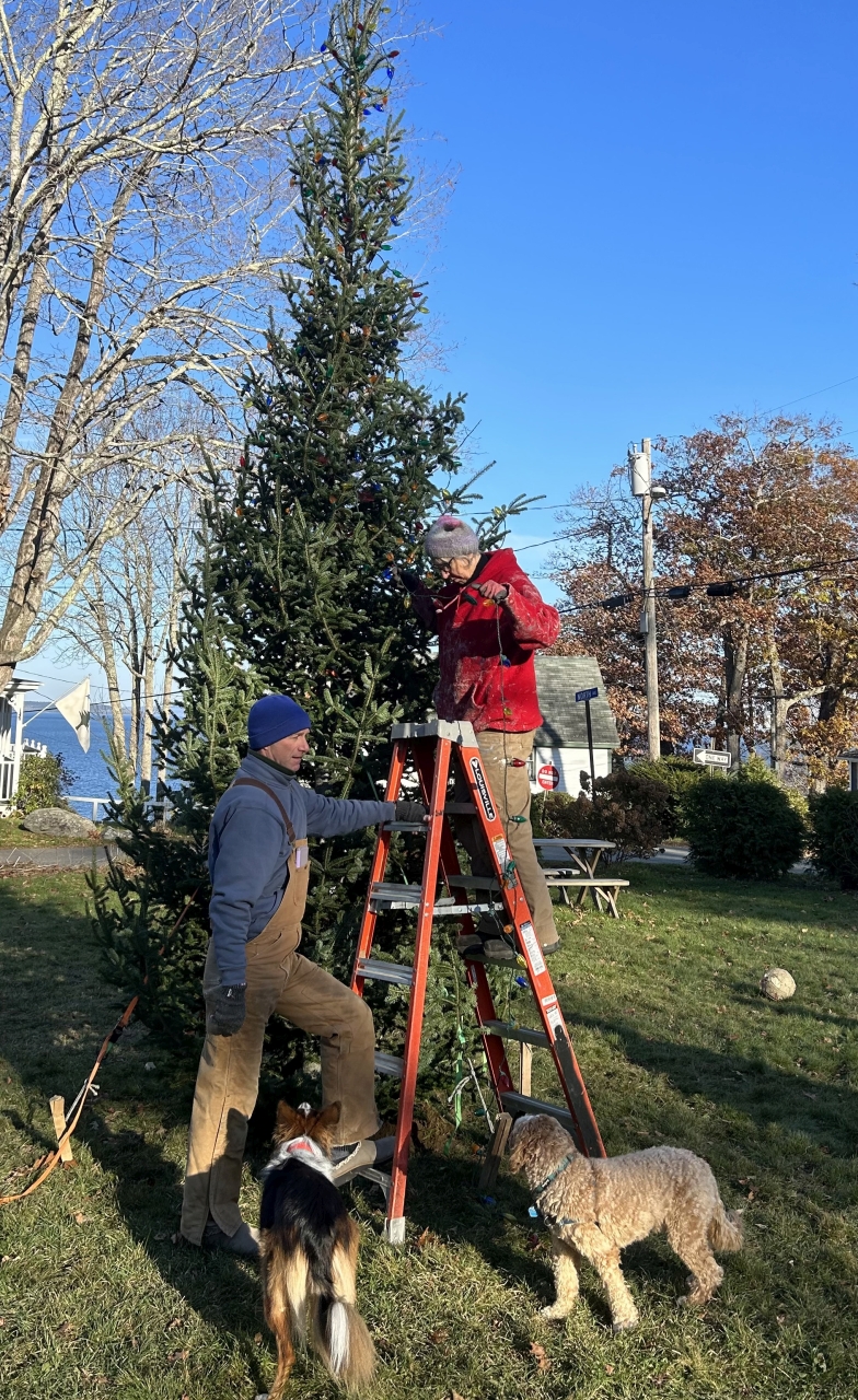 2023-11-14 Meri Elves, photographed in Bayside, ME by David Leaming. “Merithew Park residents erected and strung Christmas lights on a donated fir tree in the park in Bayside on Tuesday, November 14, 2023. Andrew Bewsher assists Brynna Ledyard with lights as canine helpers Yoko, left, and Blue watch. There will be a tree lighting ceremony on November 24 at 5:30 PM, and all are welcome.” #elves #christmastree #treelighting #merithewsquare #baysidemaine See less