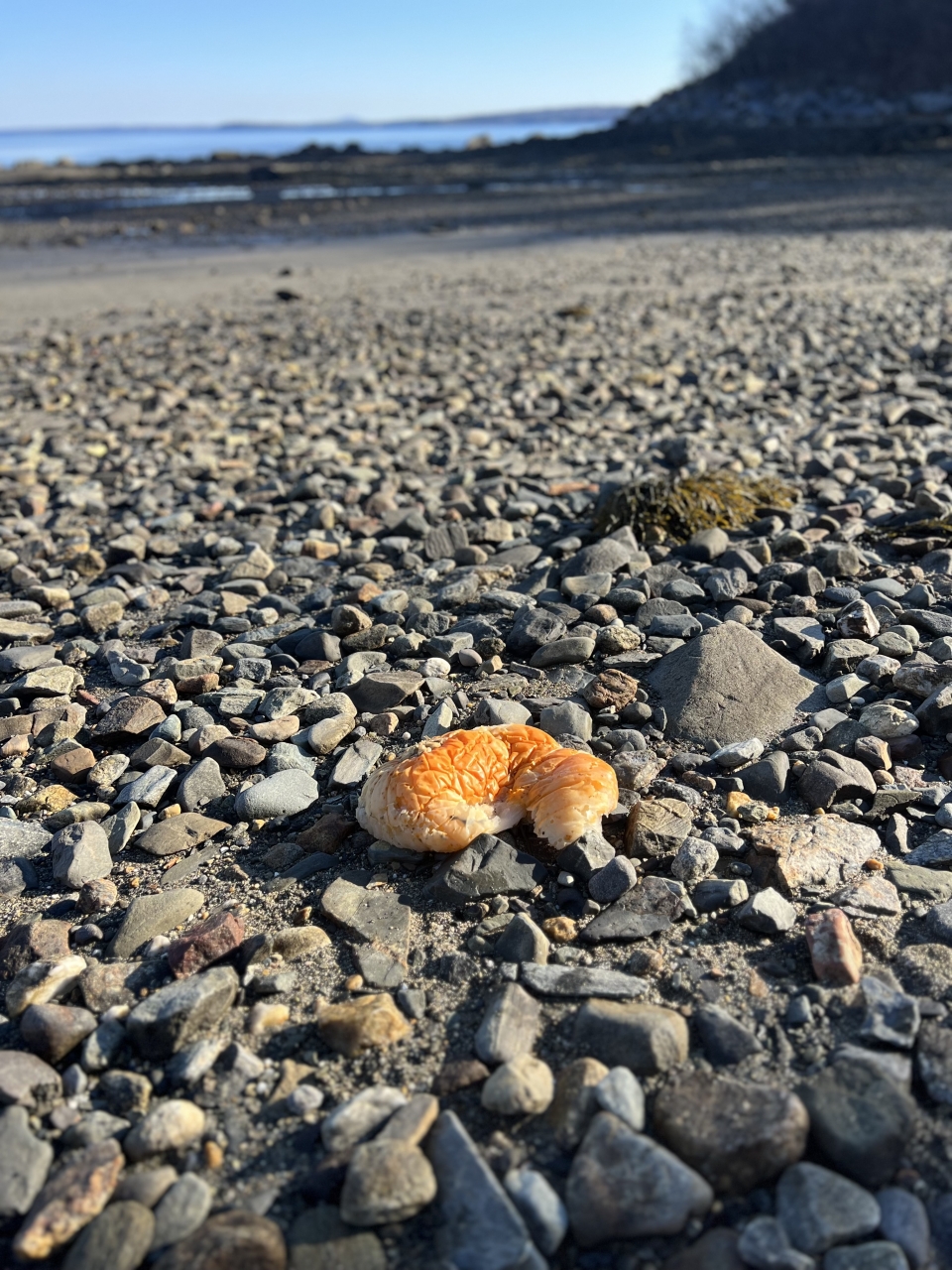 2023-11-19 Sea Pumpkin, photographed on the beach in Bayside, ME by Jutta von Dirke. “Halloween is definitely over.” #seapumpkin #oldpumpkin #beachtrash #penobscotbay #baysidemaine See less
