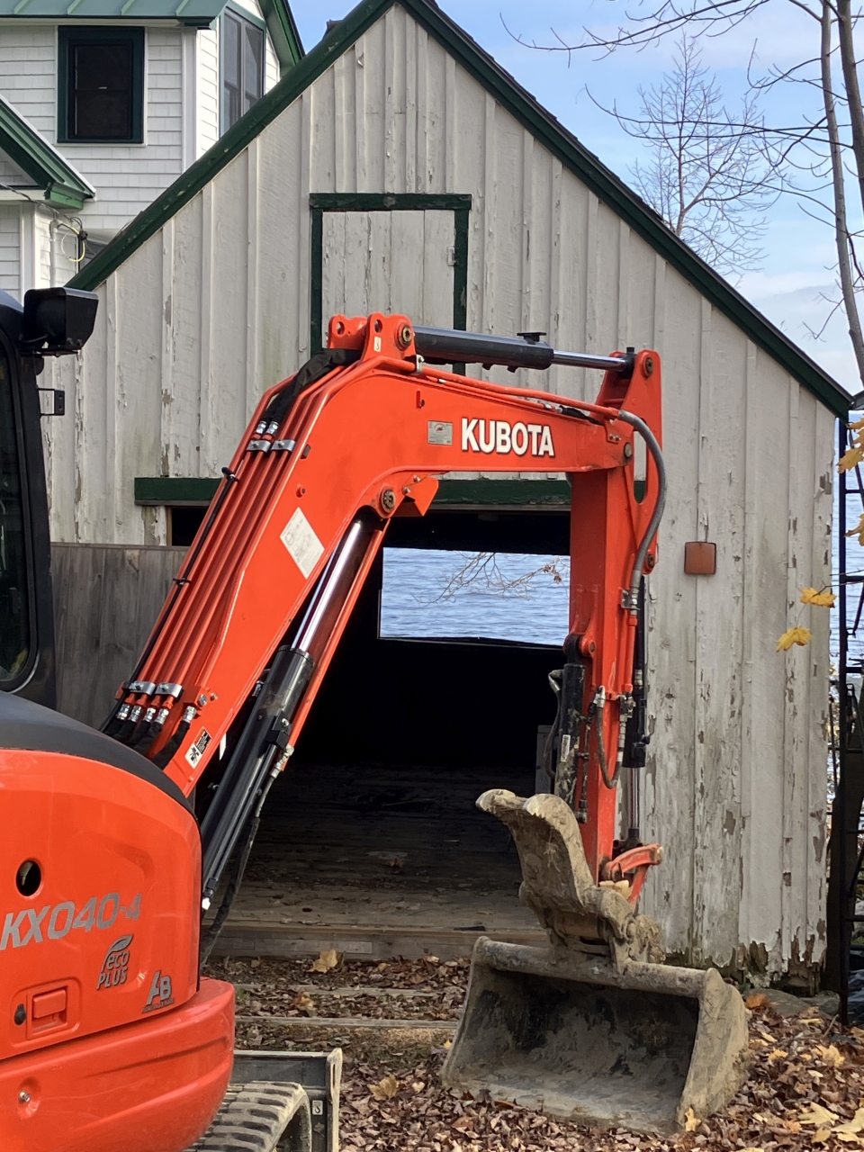 2023-12-06 Tis the Season, photographed by Beverly Crofoot on Bay Street in Bayside, ME, where this excavator looks suspiciously close to the garage of the Braking Wind cottage. Nice view, though. #renovations #fixingup #cottagelife #kubota #penobscotbay #baysidemaine