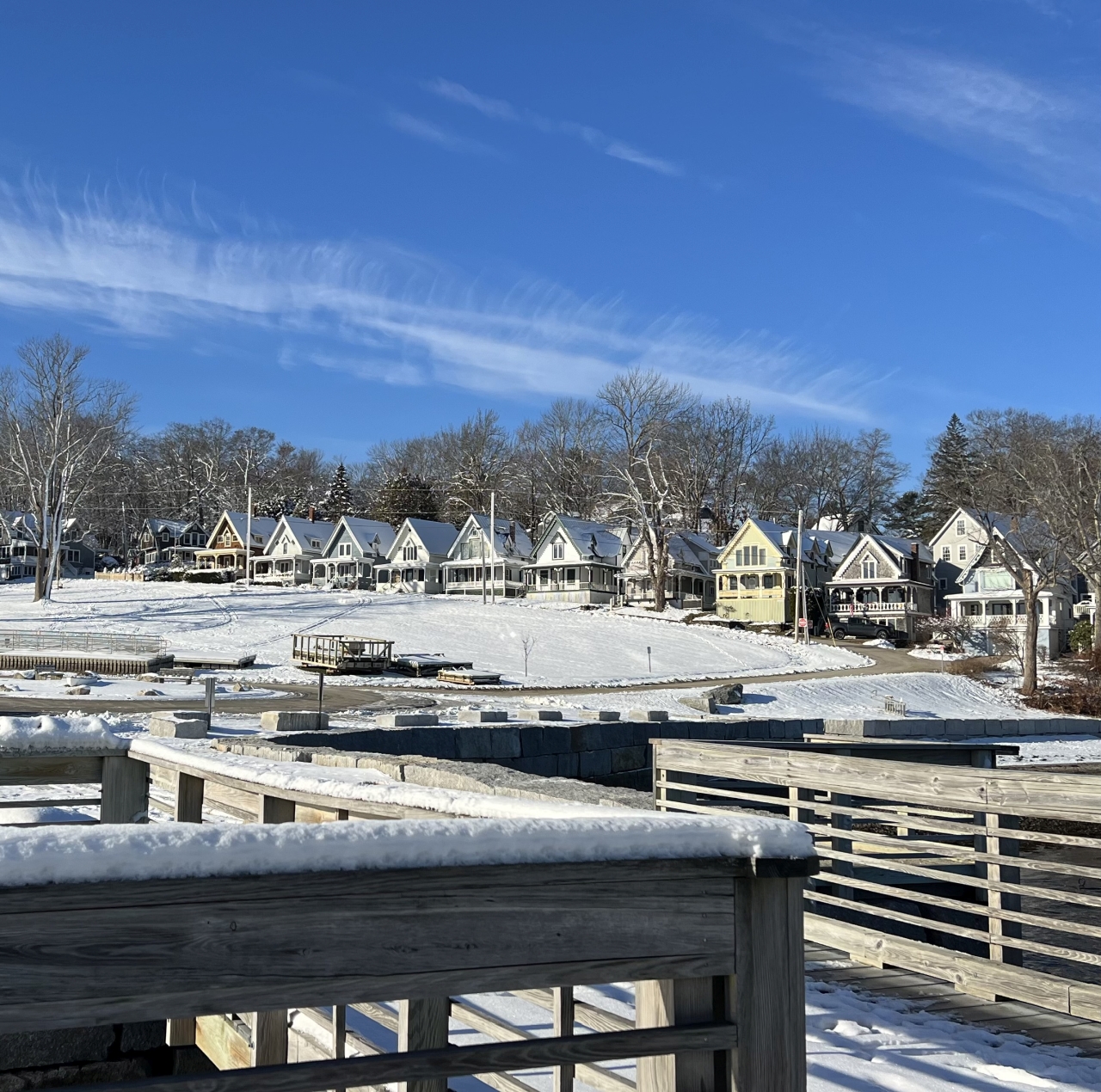 2023-12-09 First Snow, photographed this week by Jutta von Dirke from the Bayside, ME wharf facing Park Row. “Magic dwells in each beginning.” #firstsnow #sledtracks #parkrow #rugglespark #thewharf #baysidemaine