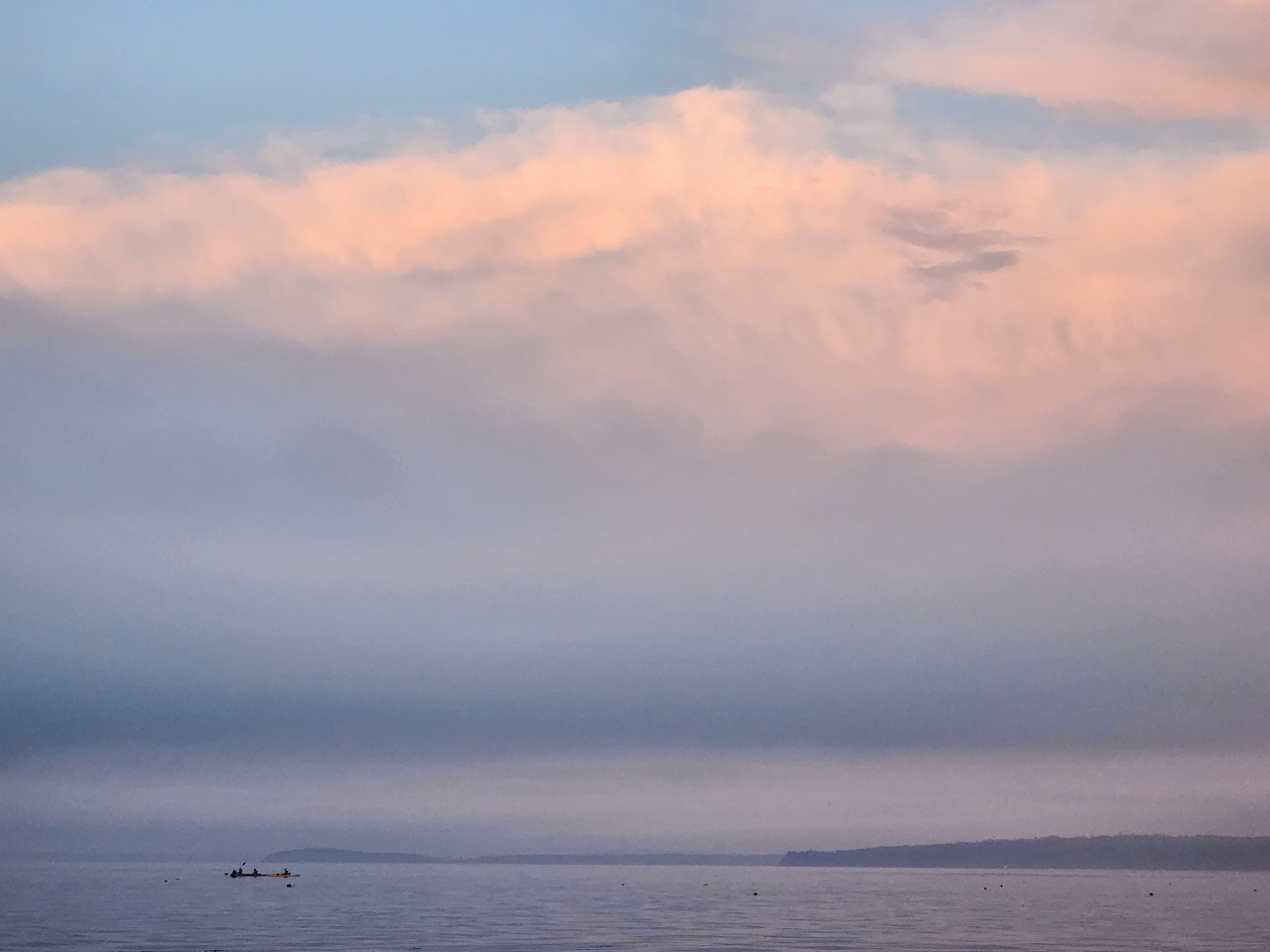 2023-12-12 Kayaking at Sunset, photographed in August by Lisa Bartusek in Bayside, ME. #kayak #sunset #bigsky #accumulatingclouds #penobscotbay #baysidemaine