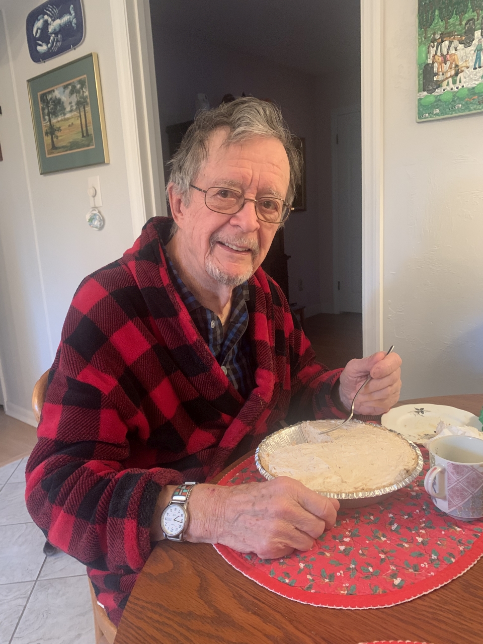 2023-12-20 Pie for Breakfast, photographed by Joy Sherman. “[Husband] Rob’s first little biographical book was entitled “Pie for Breakfast.” Ever since then, I’ve baked a peanut butter pie the day before his birthday, hidden it in the freezer, and presented it to him on his birthday. Here he is, just out of bed Tuesday, on his 93rd birthday enjoying pie for breakfast.” Happy Birthday, Rob! #pieforbreakfast #happybirthday #happy93rdbirthday #peanutbutterpie #baysidemaine