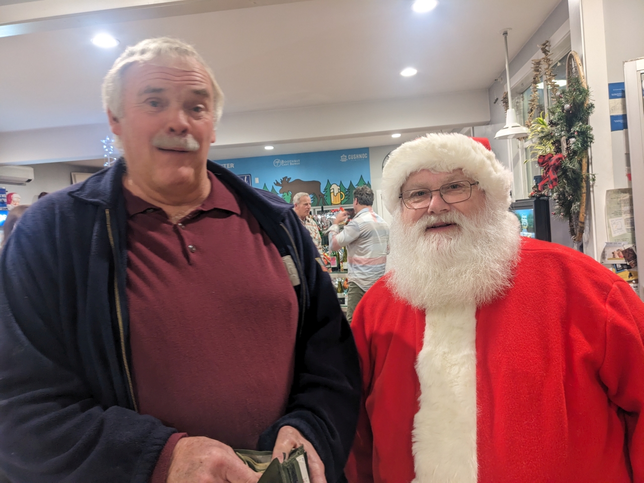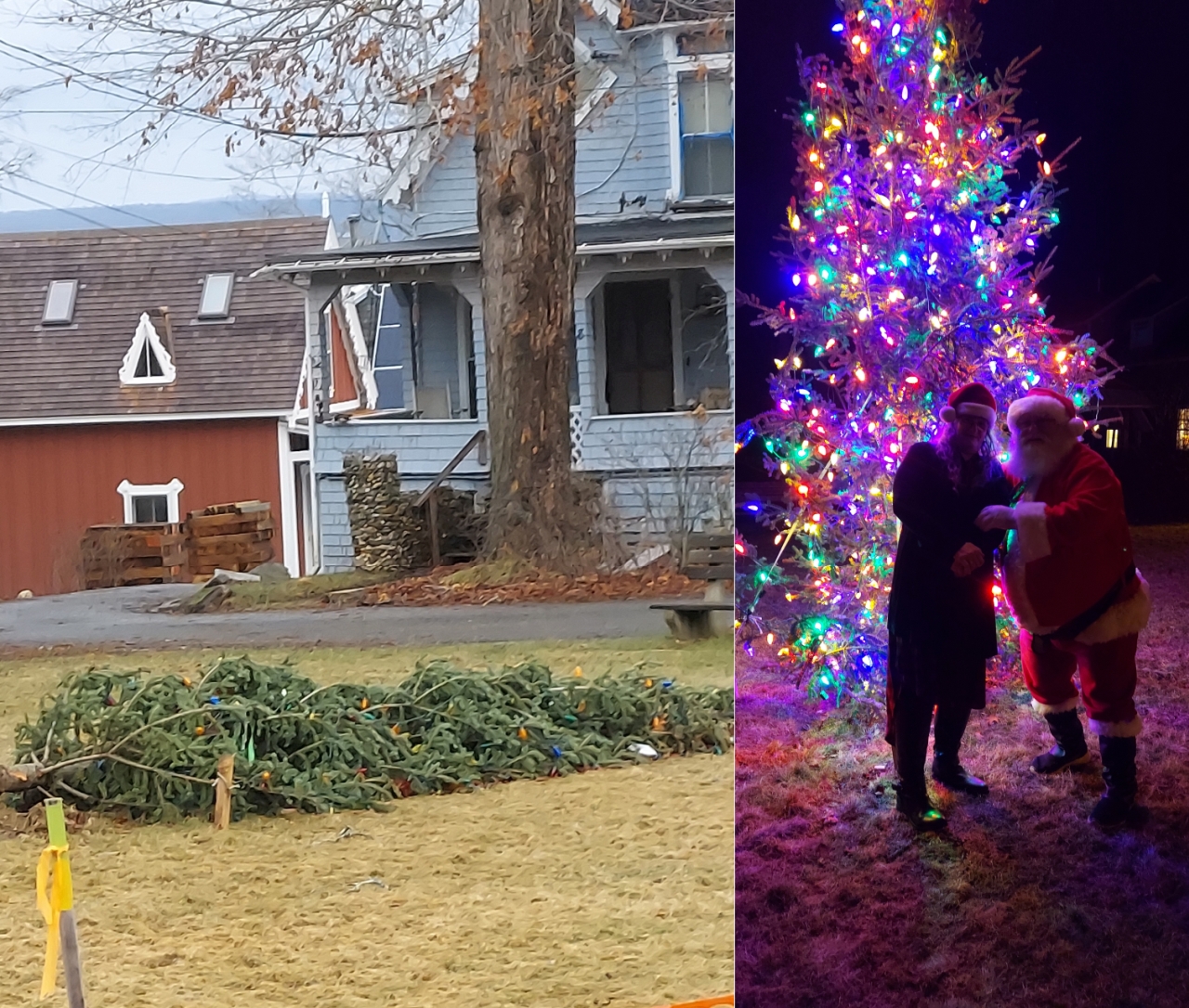 2023-12-22 Santa Saves Christmas, submitted by Bill Paige. “The Grinch came by [Merithew Square Park in Bayside, ME] and was taking the Villagers’ Christmas tree down so they wouldn’t have a tree for Christmas. So Santa came bye to help the Villagers’ get their Christmas spirit back by motivating them to put the Christmas tree back up for all to see.” Yay, Santa! #christmas #christmastree #christmasspirit #grinch #santa #santasavestheday #villagelife #merithewsquare #baysidemaine