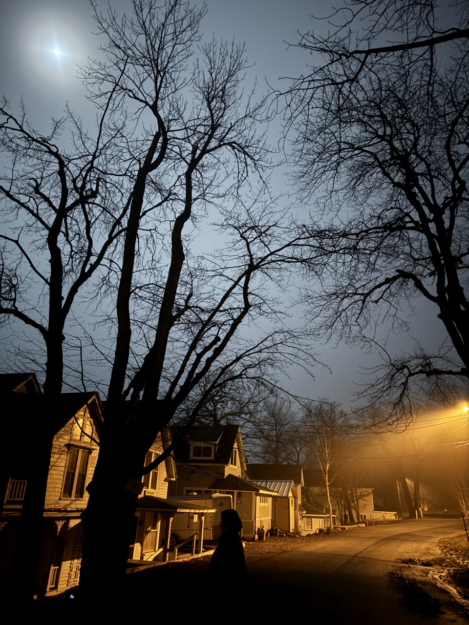 2023-12-27 Still Night, photographed on Bay Street in Bayside, ME by Bryan Blaisdell. “A foggy and eerily still night last night. Silent, heavy air, and totally unmoving water.” #fog #foggynight #stillnight #eerienight #quietvillage #offseason #baysidemaine