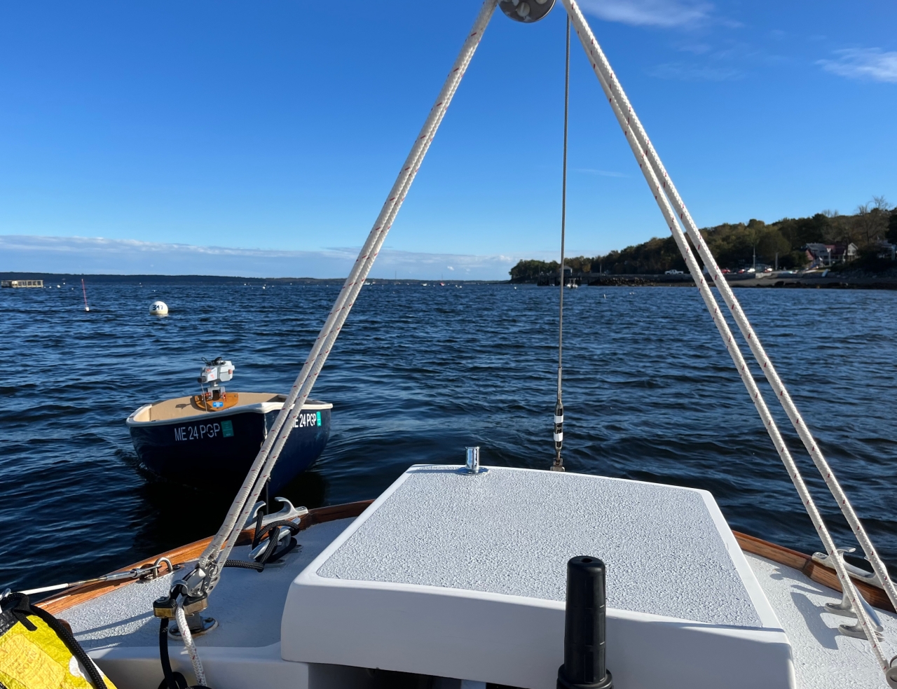 2023-12-31 Goodbye for the Season, photographed in early October by Paul Hamlin as he left the Bayside, ME anchorage to take Indigo up to Belfast to hand her over to Belmont Boatworks for the winter season. “It was a great summer, so no regrets this year leaving Bayside behind.” #goodbyefortheseason #seasonsend #timetotaketheboatout #belfastboatworks #thewharf #penobscotbay #baysidemaine