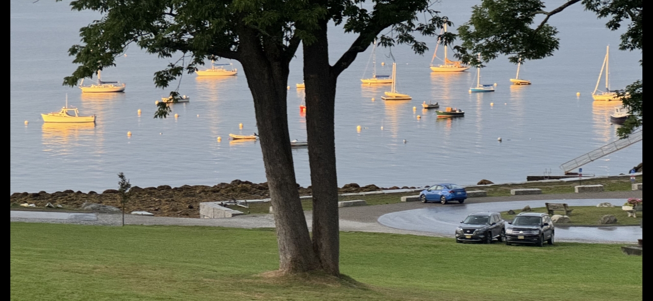 2025-01-14 Aglow, photographed last August from Bayside, ME’s Ruggles Park by Bill Cressey. “After a late afternoon cloudburst, the sun came out just in time to lend a golden color to the boats in the anchorage.” #aglow #harbor #anchorage #sailboats #moorings #aftertherain #cloudburst #thewharf #penobscotbay #baysidemaine