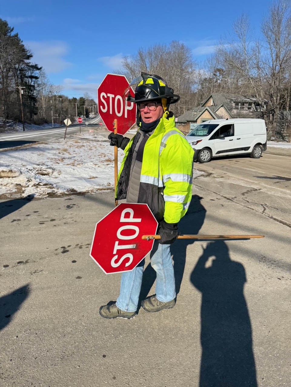 2025-01-17 Citizen Overgaag, photographed at Route 1 in Northport, ME by Bryan Lhuillier. “Volunteer emergency services worker Paul Overgaag directed traffic around Wednesday’s horrific accident (https://www.wabi.tv/…/man-suffers-life-threatening…/) that shut down Route 1 between Rocky Road and Aubuchon Hardware. Paul was out there most of the day.” #goodcitizen #communityservice #publicsafety #flagman #flagcrew #northportmaine #baysidemaine