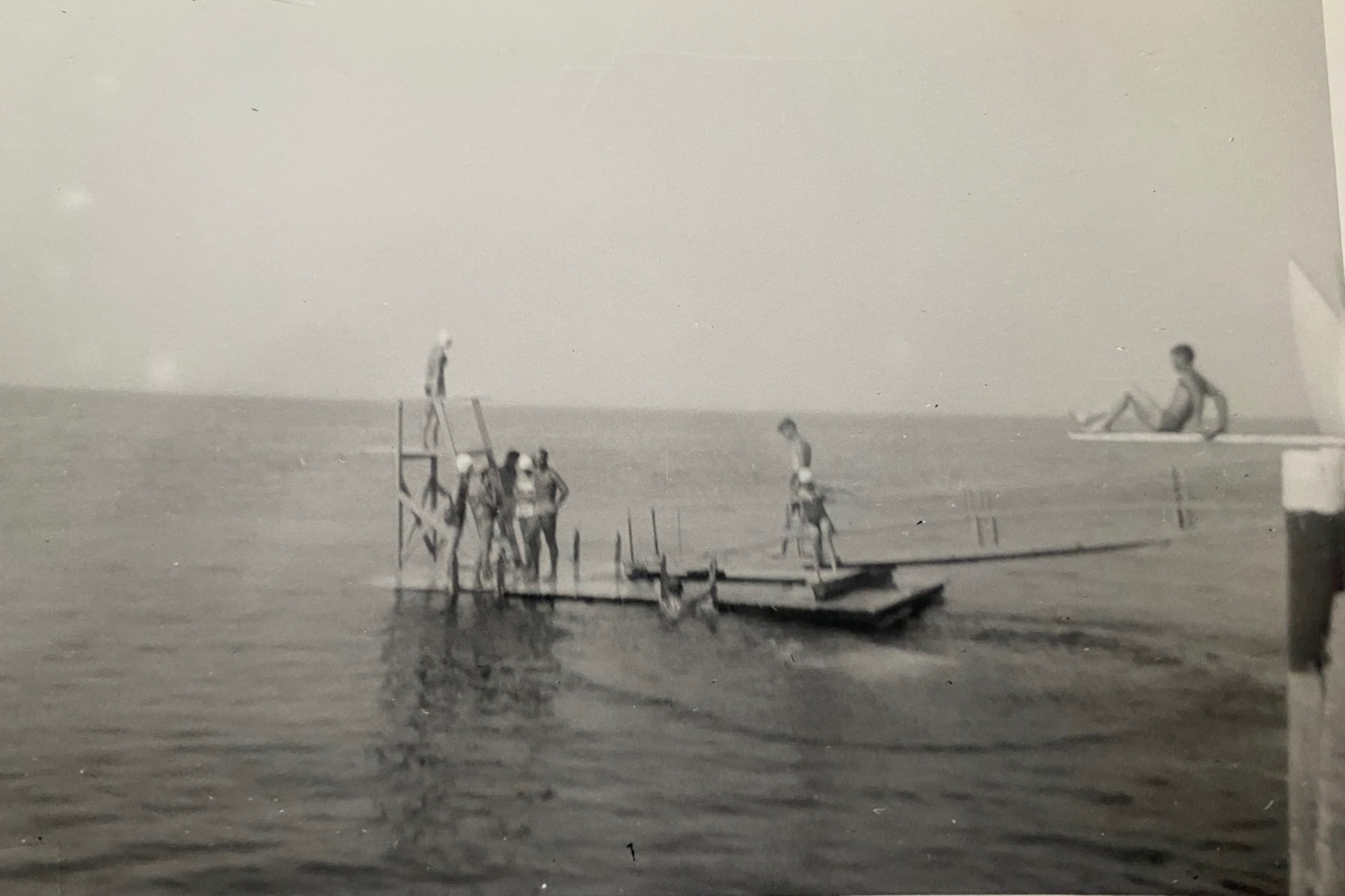 2025-01-30 Diving In, photographed on the Bayside, ME wharf in 1954 by John Coleman and submitted by Dave Witherill, who writes, “There were a lot of diving opportunities back then! When I asked John what brought him to Bayside from Connecticut, he said that his father was making business calls with a man named Jim Samway. Small world.” #tbt #1954 #diving #divingin #divingboard #swimming #swimfloat #thewharf #penobscotbay #baysidemaine