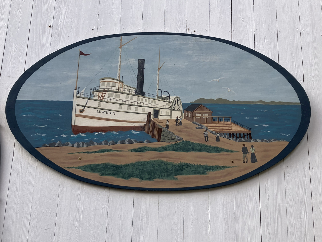 2025-02-06 Steamship Lewiston, painted by Bob Rich and submitted by Beverly Crofoot on behalf of the Bayside Historical Preservation Society (https://baysidehps.org/). Two identical paintings were donated to the BHPS by Bob and Jean Tanner Rich; one hung on the Community Hall as in this photo, and the second kept in storage. Last summer, Dave Hurley of Belfast (and sturgeon-mural fame) put three coats of a clear varnish on the second panel. It subsequently replaced the other version which had suffered loss over the years, and now resides in storage at the Community Hall. The following is the text of a letter from the Riches dated July 9, 1998: “It is our intent to donate both of our ‘Northport Landing’ business signs, in their entirety, to the Historical Society. I painted these signs in 1986 and outside of a little touch-up on one occasion, they have withstood the elements reasonably well. Perhaps their aging benefits them for the purpose that they will serve in the future. The reference that I used for the steamship S. S. Lewiston came from Allie Ryan’s book the ‘Penobscot Steamship Album.’” Thank you, Riches! #tbt #steamship #steamshiplanding #sslewiston #steamshiplewiston #rugglespark #thewharf #penobscotbay #cottagelife #oldbayside @baysidehps #bhps #baysidemaine