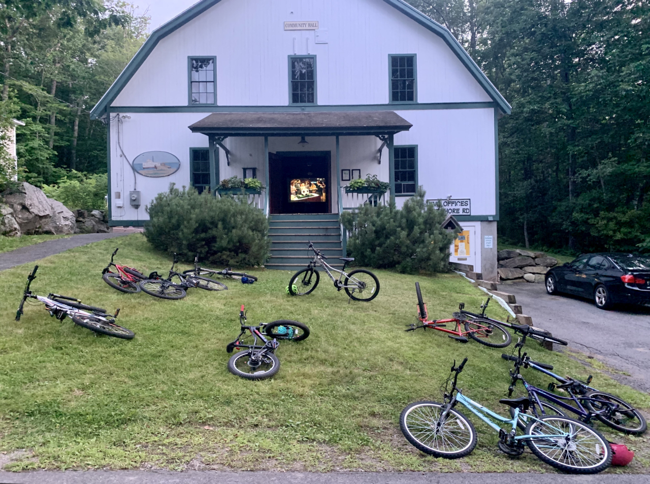 2025-03-28 Movie Night, photographed in 2023 by Deanna Wolfire at the Bayside, ME Community Hall during one of Bayside Arts’ (https://www.baysidearts.org/) kids’ movies. #baysidearts #movienight #ourlittletown #villagelife #bikeparking #lotsofbikes #bikes #bicycle #communityhall #baysidemaine