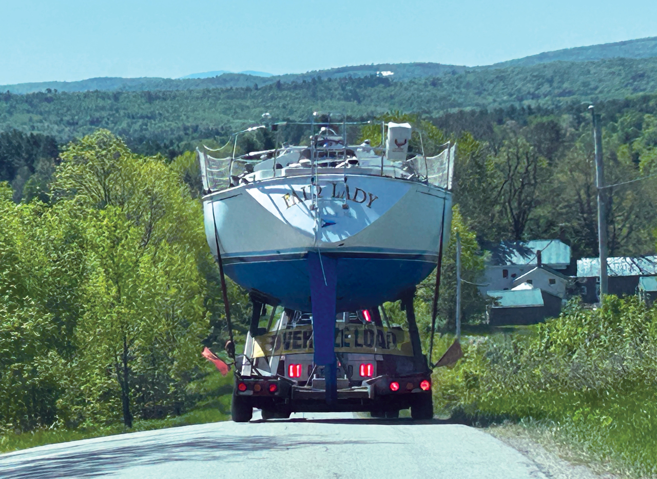 2025-03-31 All Rhodes Lead to Bayside, photographed by Paul Hamlin. “I saw this nice looking Rhodes 19 at the north-bound Kittery rest stop. It followed me home, so I plan to keep it and race this summer in Bayside (ME).” #sailboat #rhodes19 #thinkingofsummer #dreamingofsailing #sailing #reststop #kitterymaine #baysidemaine