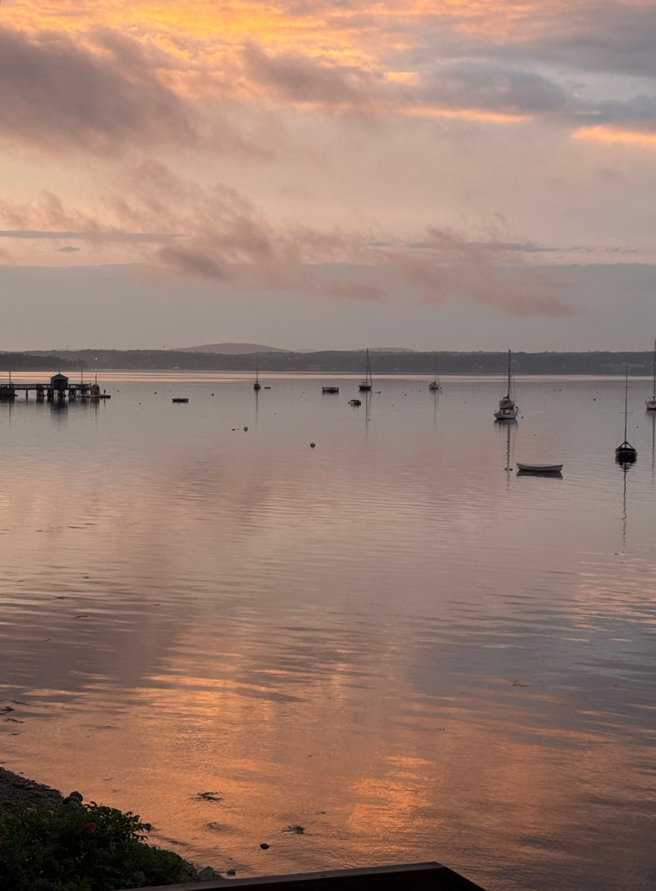 2025-09-10 And Another Day Begins, photographed by Mary Fry last month from her Clinton Avenue home in Bayside, ME. It’s foggy this morning, and the anchorage is becoming less populated as another season winds down. #sunrise #cottagelife #penobscotbay #baysidemaine