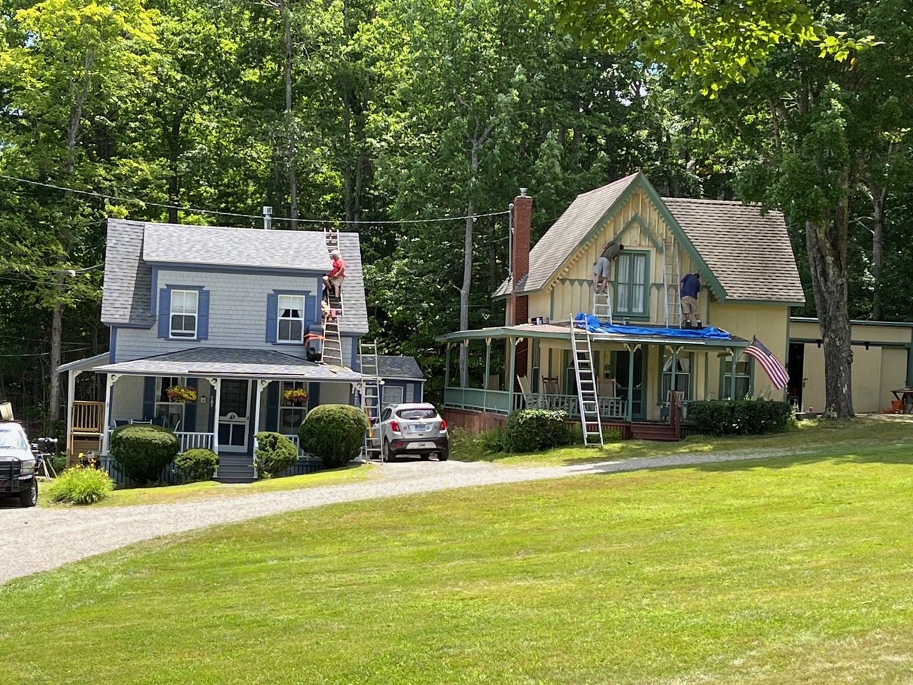 2025-08-02 Construction Zone, photographed on Bayside, ME’s Bayview park last week by Mary Ann Stankiewicz as painters worked on the Cressey and Freeman cottages, keeping the village looking sharp. #constructionzone #painting #coverup #cottagelife #bayviewpark #baysidemaine