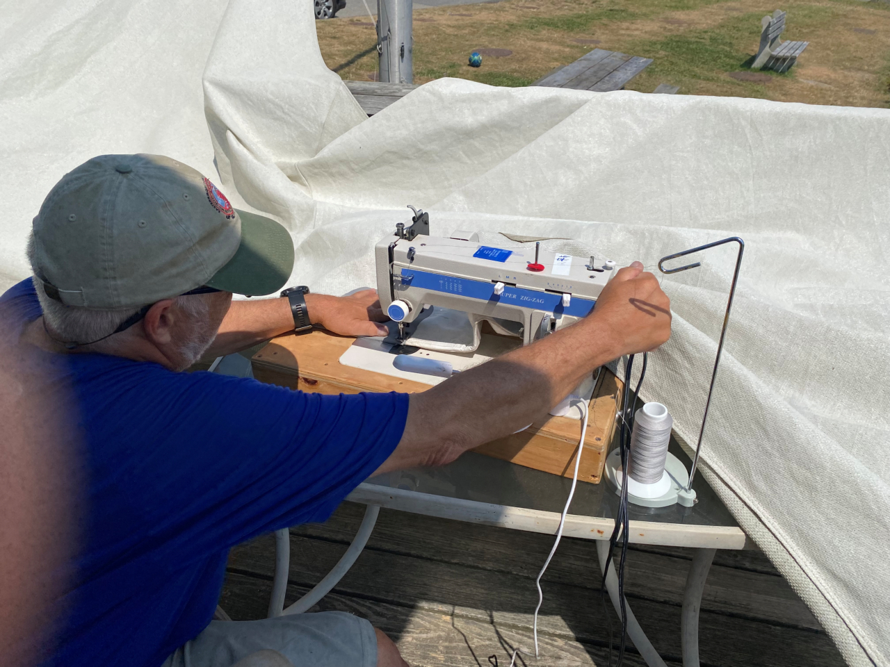 2025-08-08 Bayside’s Got Talent, photographed by Art Hall at the Northport Yacht Club in Bayside, ME. “Chris Lewton works his magic on repair to the yacht club sun awning. Thanks, Chris!” @nyc_bayside #sewing #awning #awningrepair #communityservice #baysidemaine
