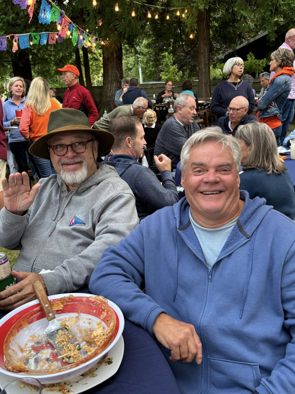 2025-09-05 Clean Plate, photographed by Vicky Webster at the Annual Gettin’ Chili Party hosted by Carla and John Lojek in Bayside, ME. In this photo, Dan Doucette is congratulating pie-eating contest winner Dave Leaming. Vicky writes, “The 2025 Chili party was the best one yet! It takes a village and the best lil’ village is what we have! Thank you Carla & John Lojek for hosting… no one does it like you two!” #chiliparty #communityspirit #gatheringoffriends #endoftheseason #ittakesavillage #cottagelife #baysidemaine