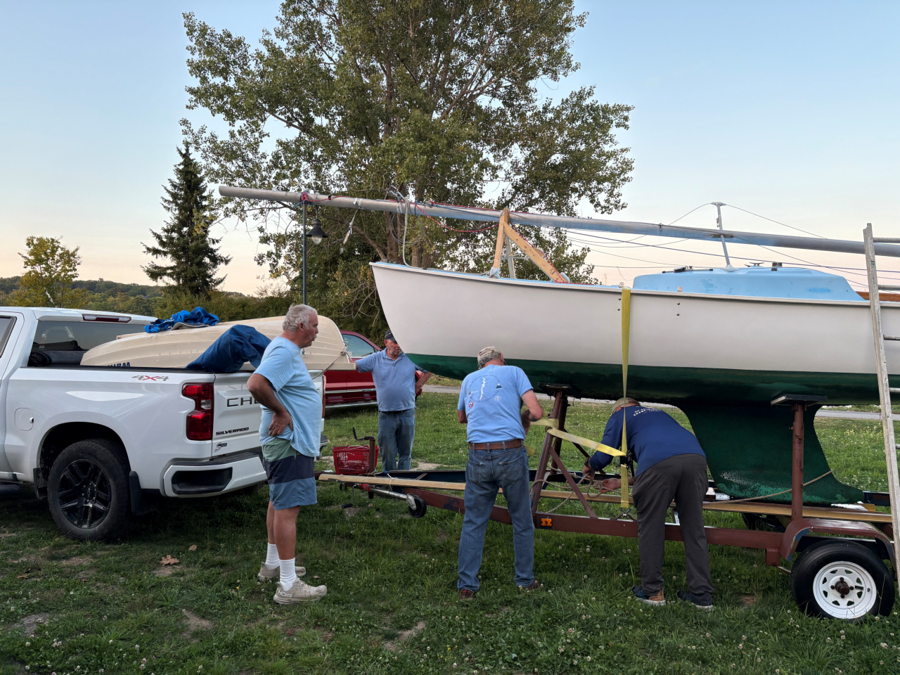 2025-09-17 Thanksgiving Day, photographed by Paul Hamlin. “It was an early Thanksgiving day for me as I had so many people helping pull my Rhodes 19 out for the season. From left-to-right are Gordon Fuller, Billy Haverty, Craig Brigham, and last but definitely not least Chris Lewton. It takes a village.” #earlythanksgiving #pullingboats #communityservice #ittakesavillage #helpinghands #endoftheseason #baysidemaine