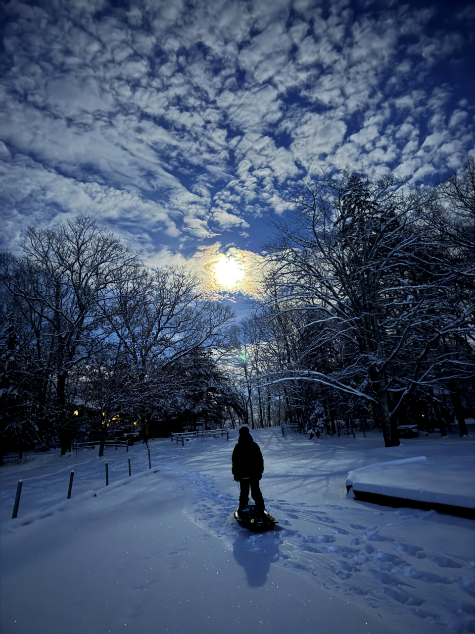 2025-12-04 Sledding at Dusk, photographed at the Northport Golf Club in Bayside, ME by Shannon Blaisdell after the season’s first snowfall. #sledding #firstsnowfall #firstsnow #moonlight #northportgolfclub #baysidemaine