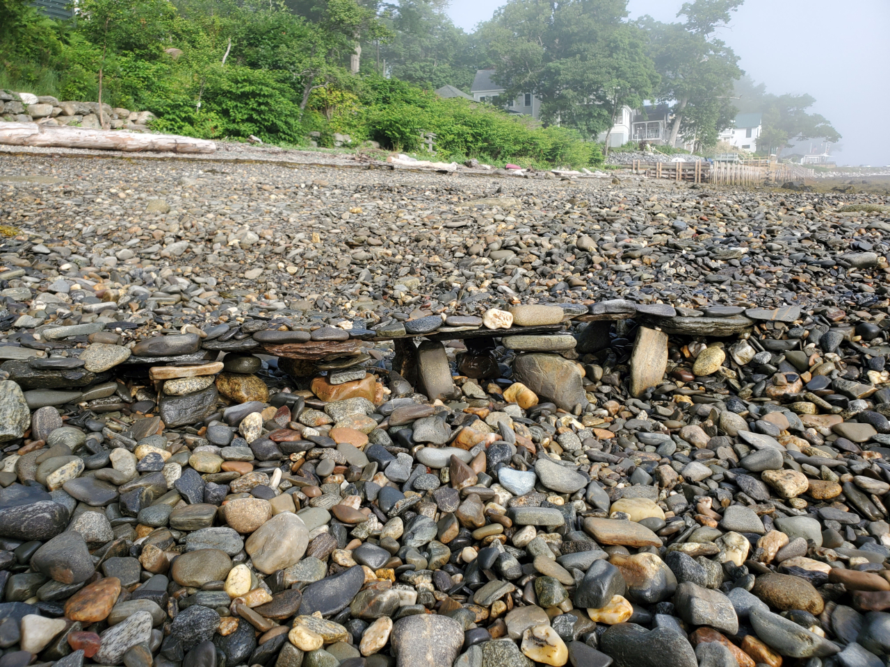 2025-12-16 Beach Bridge, submitted by Emily Stetser and photographed last July on the Bayview Park beach in Bayside, ME. “The sun was finally shining through the fog on this creative bridge found by Bob Stetser.” #rockbridge #beachbridge #pileofrocks #beachcombing #rockybeach #penobscotbay #baysidemaine
