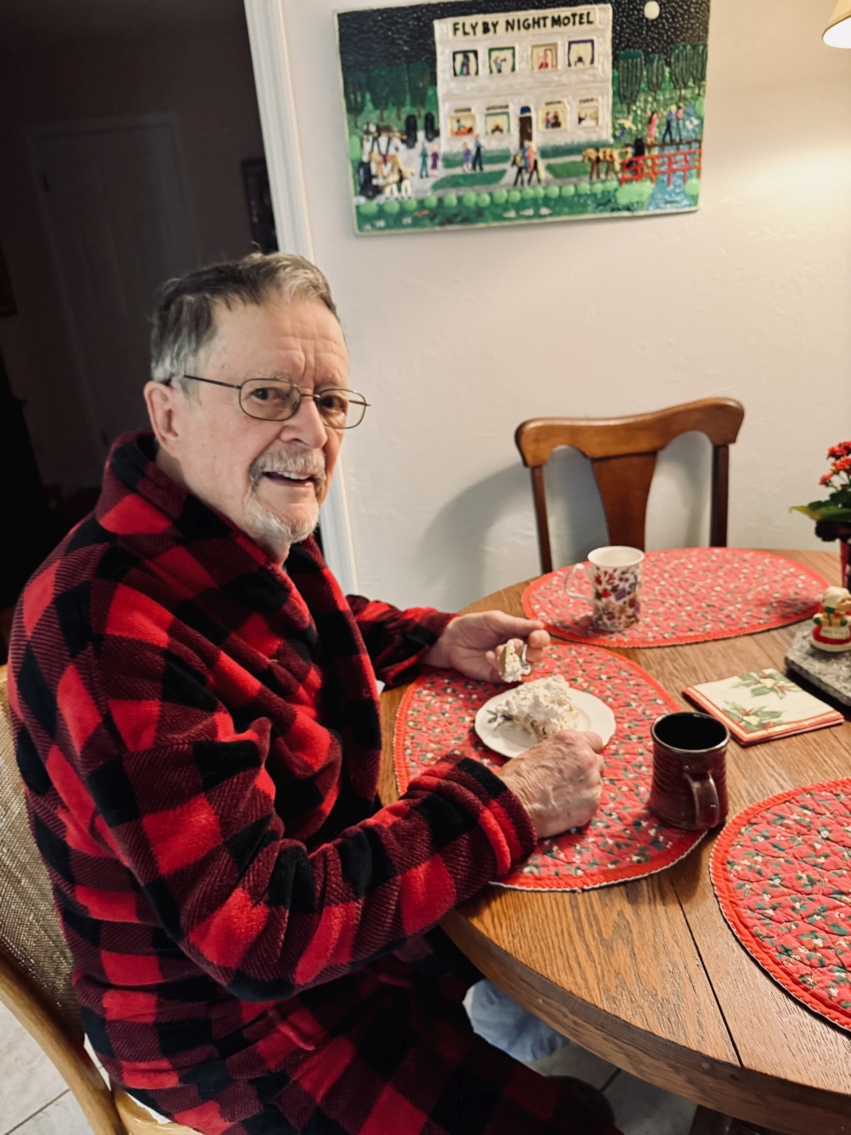 2025-12-19 Pie for Breakfast, photographed by Joy Sherman and featuring husband Rob Sherman. “Following the theme of the wonderful Surprise Party the Bayside community gave us last July, Rob is enjoying a slice of the peanut butter pie I made for his 95th birthday today. He is as well and energetic as ever. We plan to return for a Bayside visit next September and look forward to seeing many of you again.” “Pie for Breakfast” is also the name of Rob’s book (https://www.ebay.com/itm/395617622883). Happy birthday, Rob! #pieforbreakfast #95thbirthday #happybirthday #comeonback #baysidemaine